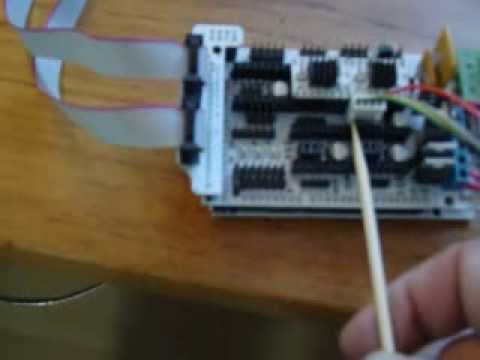How to wire up your motors, end stops, thermistors, heatbed, hotend, 12 volt power AC power and LCD screen on a RAMPS 1.4 board with an arduino mega 2560. Use caution when working with any electricity. Only trained persons qualified to do so should tamper with any power supply. You should never turn on a power supply with the cover removed, this was done to show how it was wired only. Boards and stepper motor drivers from dx.com all motors and hot end parts from robotdigg.com some files from makerfarm.com All motors are 40 mm Nema 17 all wires to heating elements are 16 gauge multi strand copper. You need thremistors, not thermocouples for this. Good luck!!